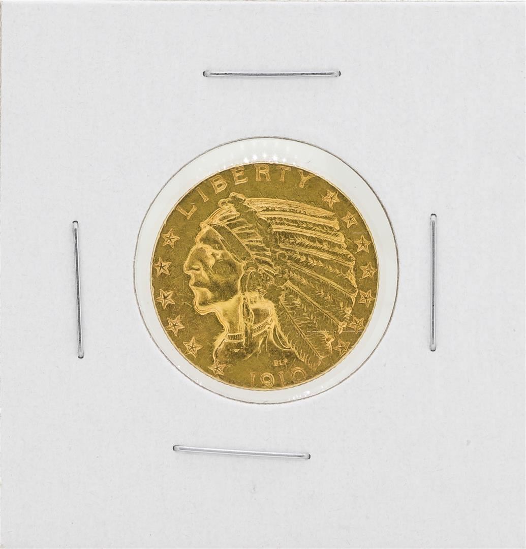 One 1910 $5 Indian Head Half Eagle Gold Coin.