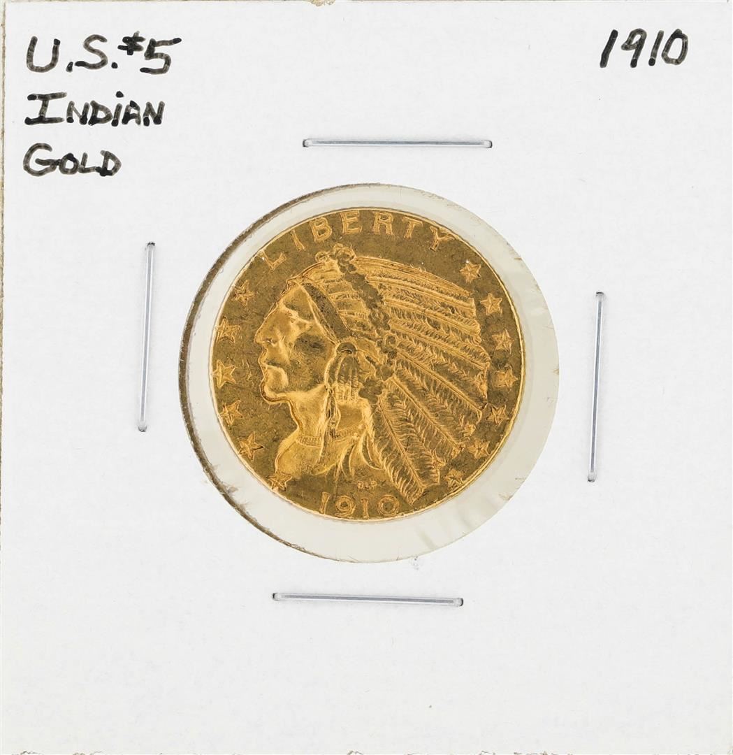 One 1910 $5 Indian Head Half Eagle Gold Coin.