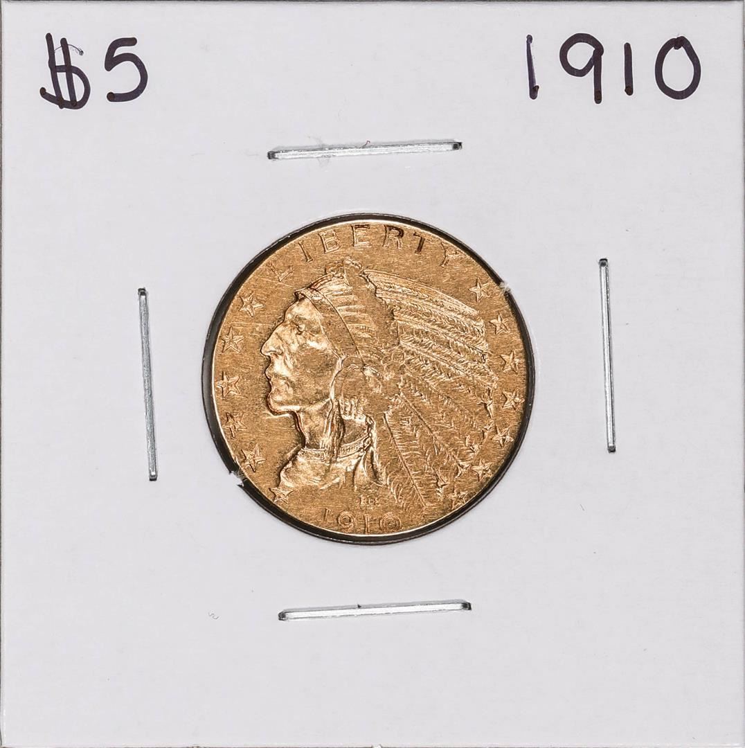 One 1910 $5 Indian Head Half Eagle Gold Coin.