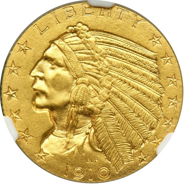 1910 $5 Indian. NGC graded Proof 66. Only 250 proofs struck. Housed in a new NGC 3 pronged holder. Well struck with light golden toning. Beautiful color and blemish-free surfaces adorn this Roman Gold finish Proof. This finish allows gem specimens to display luster to its fullest and the present specimen definitely has outstanding luster on both sides. Even with strong magnification, no problems are visible. The same slick luster is interrupted by the grading service as warranting a Proof 66 label. As such, it is a superlative Proof gold rarity, much more so than the mintage figure would imply. With the highest mintage for Proof Indian Head half eagles (250 coins), one could be misled about the rarity of this issue. For reasons unknown, perhaps melting or excessive use, the 1910 is one of the scarcest Proofs in the series. Many years may lapse before the offering of another such true gem which is why we urge our clients to consider this when bidding. Pop 13; 10 finer, 1 in 66 Star, 2 in 67, 3 in 67 Star, 3 in 68, 1 in 68+ (PCGS # 8541) .