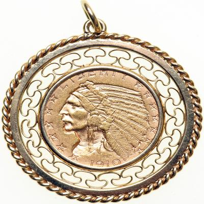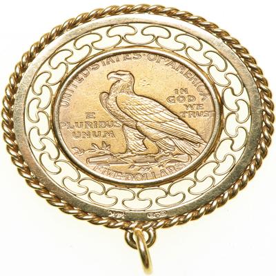 1910 $5 Indian. Mounted in a deluxe 14 kt gold bezel. The coin grades EF.