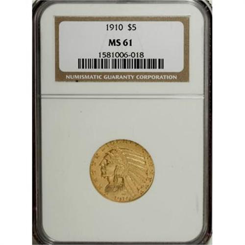 <B>1910 $5 MS61 NGC.</B></I> NGC Census: (893/1495). PCGS Population (311/1293). Mintage: 604,250. Numismedia Wsl. Price for NGC/PCGS coin in MS61: $535. (#8517)<BR><BR><B>Coin Engraver:</B> Bela Lyon Pratt<BR><BR><b>Shipping:</b> Coins & Currency (<a target="_blank" href="http://www.heritageauctions.com/common/shipping.php">view shipping information</a>)
