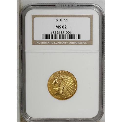 1910 $5 MS62 NGC. Rich orange-gold color is the hallma