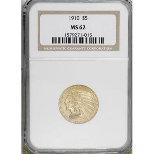 <B>1910 $5 MS62 NGC.</B></I> NGC Census: (1045/451). PCGS Population (756/582). Mintage: 604,250. Numismedia Wsl. Price for NGC/PCGS coin in MS62: $1,110. (#8517)<BR><BR><B>Coin Engraver:</B> Bela Lyon Pratt<BR><BR><b>Shipping:</b> Coins & Currency (<a target="_blank" href="http://www.heritageauctions.com/common/shipping.php">view shipping information</a>)