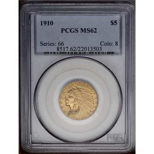 <B>1910<$5> MS62 PCGS.</B></I> Pale yellow luster with moderate surface marks that are expected for the grade. This is a pleasing example for the grade, with satiny fields and frosty devices. <BR><BR><B>Important notice:</B> Heritage usually auctions material at the rate of 200-250 lots per hour. On some occasions eBay Live bid software or the Internet may not be able to keep up with the pace of the auction. We recommend placing a realistic absentee bid now as insurance to avoid disappointment. Occasionally the auctioneer may eliminate or reject an eBay Live bid, and the auctioneer may also reopen a lot after the close of the eBay live bidding (usually because we missed an audience bid), and may reject your bid even if it shows you as the winning bidder. By bidding via eBay Live, you agree that Heritage may award the lot to another bidder at its sole discretion under the circumstances described above or any other reasonable circumstances. Since eBay bids are not shown to us until we open the lot on the floor, we treat those bids just like floor bids. In most cases the floor responds before the eBay bid is presented to us, due to Internet lag time, so for consistency we have made it a policy that floor bids are always considered first over tie eBay live bids. Also please note that all Heritage lots purchased through eBay Live carry a 20% Buyer's Premium. Please make sure you read the Terms and Conditions before you bid. This lot is being auctioned in conjunction with a live floor auction by Heritage Galleries & Auctioneers. All final auction and invoice information will be supplied by Heritage Galleries & Auctioneers, and all other information should be considered preliminary. Lot:2885 <BR><BR><B>Winning Notification and Billing:</B> After the FINAL session in this auction is complete, Heritage will send e-mail and snail mail invoices. This process normally takes several days. All final auction and invoice information will be supplied by Heritage Galleries & Auctioneers, and all other information should be considered preliminary. <BR><BR>This auction will be conducted on a live auction floor and over the Internet through eBay Live. If you choose to place an absentee bid, please take a moment to <font color='#0000ff'><u><a href='http://pages.ebay.com/liveauctions/help/before/laabsentee.html'>learn how eBay Live absentee bidding works</a></u></font><font color='#000000'>