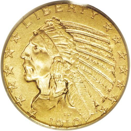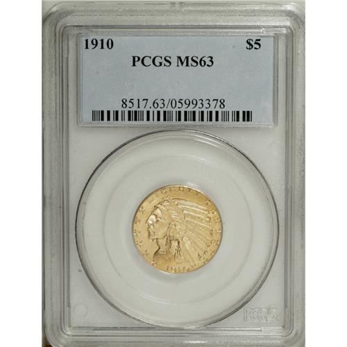 <B>1910 $5 MS63 PCGS.</B></I> The date is considered a common one among Indian Head half eagles and examples are available in all grades through MS65. This sharp example has lustrous yellow-gold surfaces with few imperfections on either side. For a particular challenge, a complete set of MS63 grade Indian half eagles will keep a collector busy for quite a long time.<BR><BR><b>Shipping:</b> Coin/Currency (<a target="_blank" href="http://www.heritageauctions.com/common/shipping.php">view shipping information</a>)