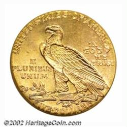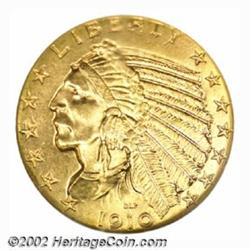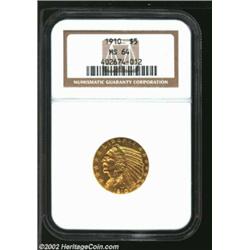 1910 $5 MS64 NGC. The 1910 is equally as well produced as the 1909. Sharply struck over every feature, this attractive near-Gem exhibits original yellow-gold color. Both sides are satiny in texture, and there are very few blemishes of any kind. A conditionally scarce survivor of this otherwise common (by Indian Half Eagle standards) P-mint delivery. Important notice: We expect to be auctioning lots at the rate of 200-250 per hour. Sometimes eBay Premier live bid software cannot keep up with that pace, so we strongly recommend that you place a realistic proxy bid now as insurance to avoid disappointment. Also please note that all Heritage/CAA lots purchased through eBay Premier carry a 20% Buyer's Premium. Please make sure you read the Terms and Conditions.