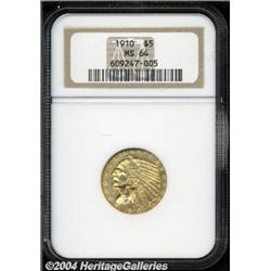 <B>1910<$5> MS64 NGC.</B></I> Produced in respectable numbers (604,250 pieces), the 1910 is among the more common Indian Half Eagles in an absolute sense. Like most dates in this series, however, the 1910 is usually offered in grades no finer than MS63. An above average Choice representative, this coin is boldly, if not sharply struck throughout. Softly frosted with full luster quality, the yellow-gold surfaces are smooth enough to match the outward appearance of a Gem.<BR><I>From The Greenwich Collection, Part One.</B></I> <BR><BR><B>Important notice:</B> Heritage usually auctions material at the rate of 200-250 lots per hour. On some occasions eBay Live bid software or the Internet may not be able to keep up with the pace of the auction. We recommend placing a realistic absentee bid now as insurance to avoid disappointment. Occasionally the auctioneer may eliminate or reject an eBay Live bid, and the auctioneer may also reopen a lot after the close of the eBay live bidding (usually because we missed an audience bid), and may reject your bid even if it shows you as the winning bidder. By bidding via eBay Live, you agree that Heritage may award the lot to another bidder at its sole discretion under the circumstances described above or any other reasonable circumstances. Since eBay bids are not shown to us until we open the lot on the floor, we treat those bids just like floor bids. In most cases the floor responds before the eBay bid is presented to us, due to Internet lag time, so for consistency we have made it a policy that floor bids are always considered first over tie eBay live bids. Also please note that all Heritage lots purchased through eBay Live carry a 20% Buyer's Premium. Please make sure you read the Terms and Conditions before you bid.