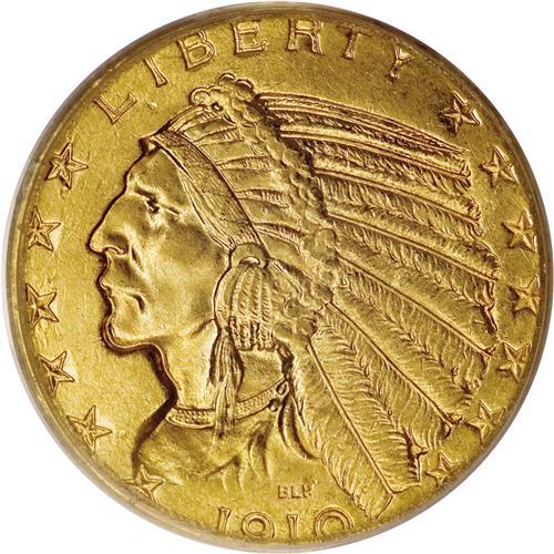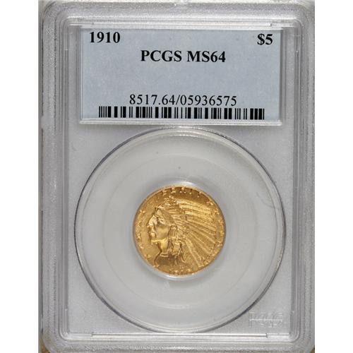 <B>1910 $5 MS64 PCGS.</B></I> One of the more available five dollar Indians, and a date that occasionally can be located in near-Gem condition. This is a lovely example that is almost completely struck up. The surfaces are bright and satiny, and there are no obvious or detracting abrasions on either side.<BR><BR><b>Shipping:</b> Coins & Currency (<a target="_blank" href="http://www.heritageauctions.com/common/shipping.php">view shipping information</a>)