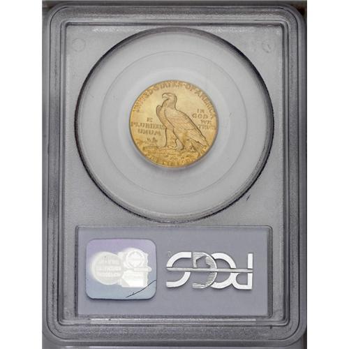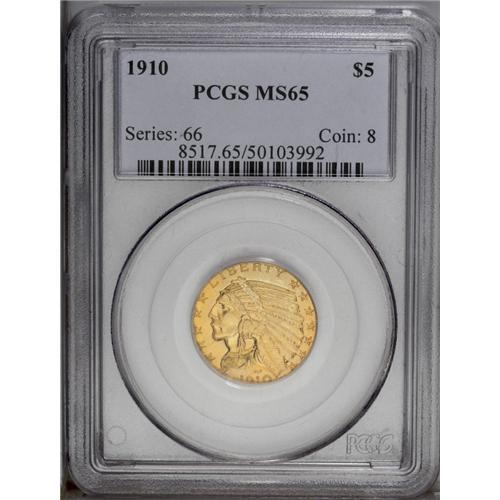 <B>1910<$5> MS65 PCGS.</B></I> While any Gem quality Indian Head half eagle is a rarity, the 1910 seems to be more available in this grade than most other issues, yet it is still an important condition rarity in the series. In fact, we have handled less than 10 Gem pieces over many years. Despite its availability, higher grade Premium or Superb Gem pieces are virtually non-existent. In fact, this piece is tied for the finest example ever certified by PCGS. It is sharply struck with full design details on both sides and it has fully brilliant and satiny orange-gold luster. Population: 17 in 65, 0 finer (9/06).