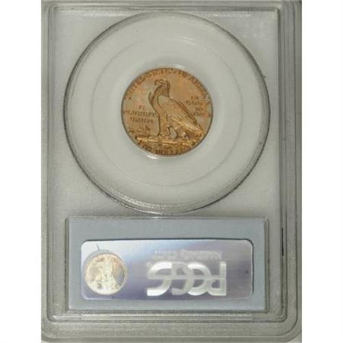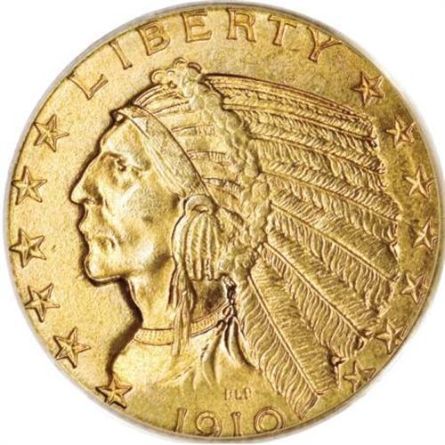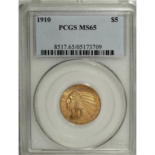 <B>1910 $5 MS65 PCGS.</B></I> Gold gurus Jeff Garrett and Ron Guth note that they consider the 1910 issue "an available date in Gem grades for this series." The last three words of warning are key to understanding the statement, however, as pieces in MS65 are a full order of magnitude rarer than MS64 pieces, according to the current combined NGC/PCGS population data. While it is true that Gem 1910s are more available, according to Garrett-Guth, than 15 of the 24 issues in the series, it is equally true that Gems of whatever stripe are the subject of intense demand by type and date collectors alike. <BR> This piece is one of 17 Gems of the issue so certified at PCGS, and there are none finer at that service. NGC has certified 21 pieces in MS65, with two coins finer (7/07). The surfaces offer striking eye appeal, with a combination of deep sunset orange-red in the fields complementing tinges of azure-hazel on the highpoints. Brilliant luster emerges unimpeded from both sides, which show none but the most trivial contact marks away from the focal areas. Simply lovely!<BR><I>From The Jim O'Neal Collection of Indian Half Eagles.</B></I><BR><BR><B>Coin Engraver:</B> Bela Lyon Pratt<BR><BR><b>Shipping:</b> Coins & Currency (<a target="_blank" href="http://www.heritageauctions.com/common/shipping.php">view shipping information</a>)