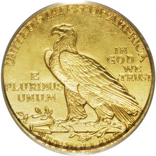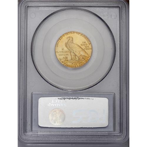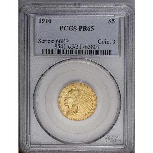 <B>1910 $5 PR65 PCGS.</B></I> The total production of this issue has been recently placed at 299 coins, higher than the mintage of 250 coins that was officially recorded by the Philadelphia Mint. Of course, given the true rarity of these proof gold coins, especially in Gem condition, it almost doesn't matter what the actual mintage was in 1910. What matters is the number that have survived over the years, and that is a very small number.<BR> The satiny surfaces have lovely medium yellow color with greenish tones on the reverse. It is not as reflective as the larger denominations of this year, yet the surfaces are similar in overall appearance, with the Roman gold finish. Every individual design details is extraordinarily well defined. Population: 7 in 65, 1 finer (1/06).