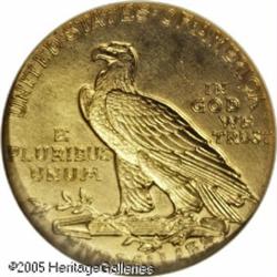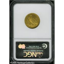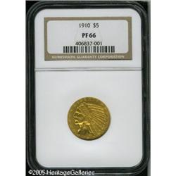 <B>1910 $5 PR66 NGC.</B></I> Struck in the Roman Gold finish that is common only on gold proofs of 1909 and 1910, this piece shows the fine grain texture unique to that method of proofing. To the uninitiated this finish is sometimes confused with business strikes, but there is a very real and perceptible difference between the two when examined side by side. The obverse shows no shiny spots and to our eyes appears perfect. On the reverse there is a slightly shiny area in the field behind the eagle's neck. Altogether a beautiful example of this rare and short lived variant of the matte proofing process. Population: 11 in 66, 8 finer (1/05). Lot:8713