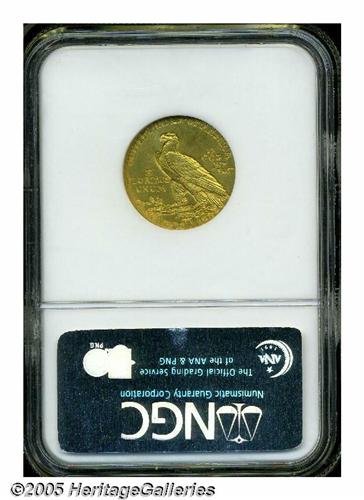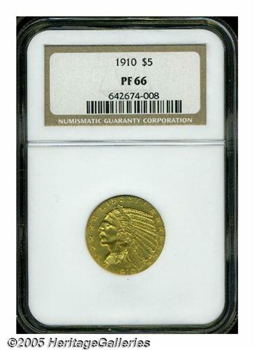 <B>1910<$5> PR66 NGC.</B></I> The official mintage for proof Half Eagles from 1910 is the highest of any date of its type, listed at 250 pieces. This figure is either incorrect or a great many were melted at year's end as unsold because the 1910 is approximately twice as rare as the 1908, of which fewer pieces were struck, and of equal rarity with the 1909, an issue with only 78 proofs officially minted. Akers only recorded 17 auction sales of proofs over the decades he surveyed major gold auctions, and while more examples obviously exist, we estimate that no more than 50-55 coins are extant in all grades. The 1910 continues the two-year tradition of using the Satin or Roman Gold finish on gold proofs.<BR> Many business strikes were similarly finished, but there can be no doubt about the method of manufacture of this lovely, fully struck proof. The surfaces have a very fine granular texture and appear to be essentially as struck. Each side imparts a subtle green-gold appearance. With the unaided eye, one fails to notice any blemishes, spots, or shiny areas that might lessen this splendid coin's pristine status. Population: 13 in 66, 9 finer (5/05).