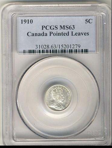 1910 5¢ Pointed Leaves PCGS MS63. Blast white and lustorus.