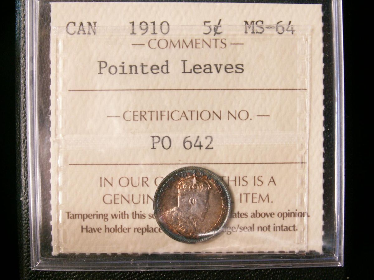 1910 5¢ Ptd Lvs ICCS MS64. Intensely toned reverse side.