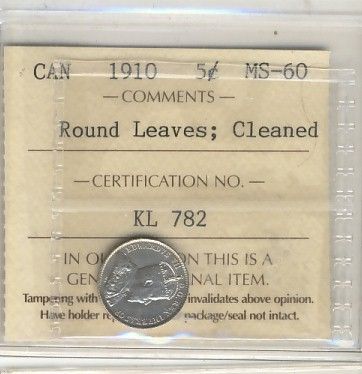 1910 5¢ Rd Lvs ICCS MS60. Scarce variety, designated cleaned.