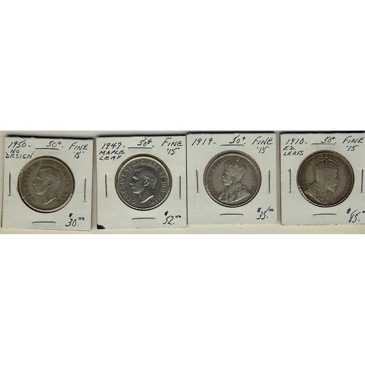1910 50¢ EL, 1919, 1947ML & 1950 No Des. Lot of 4 coins all Fine+. (PBA)