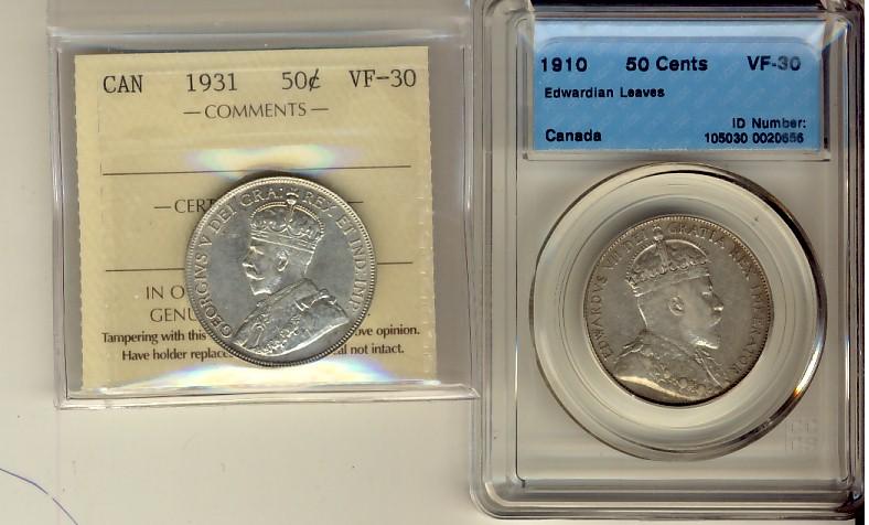 1910 50¢ Edw Lvs CCCS VF30 & 1931 50¢ ICCS VF30. Lot of 2 coins.