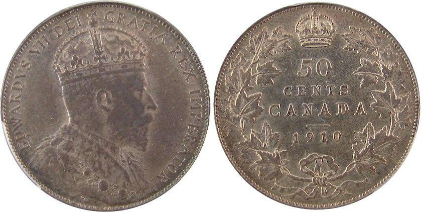 1910 50¢ Edward PCGS AU50. Well struck issue. Nice lustre underneath.