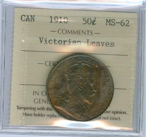 1910 50¢ Vict Lvs ICCS MS62. Intense toning with underlying lustre.