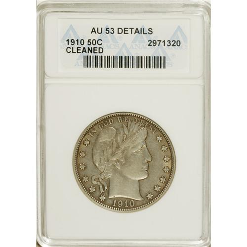 <B>1910 50C --Cleaned--ANACS. AU53 Details.</B></I> NGC Census: (6/180). PCGS Population (3/118). Mintage: 418,000. Numismedia Wsl. Price for NGC/PCGS coin in AU53: $358. (#6519)<BR><BR><b>Shipping:</b> Coins & Currency (<a target="_blank" href="http://www.heritageauctions.com/common/shipping.php">view shipping information</a>)