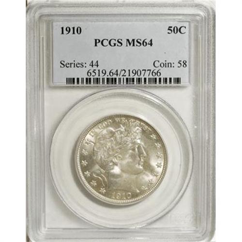 <B>1910 50C MS64 PCGS.</B></I> Boldly struck, highly lustrous, and essentially untoned. This near-Gem Barber half is well preserved, with a moderate abrasion on obverse star 6 that extends onto the back edge of Liberty's cap as its only obvious grade-limiter. A low mintage date that is very scarce at this grade level or finer. Population: 36 in 64, 25 finer (8/07). <BR><BR><B>Coin Engraver:</B> Charles E. Barber<BR><BR><b>Shipping:</b> Coins & Currency (<a target="_blank" href="http://www.heritageauctions.com/common/shipping.php">view shipping information</a>)