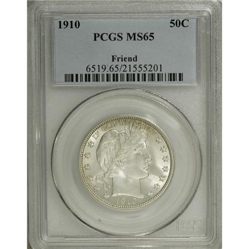 <B>1910 50C MS65 PCGS.</B></I> Ex: Friend. A brilliant and lovely Gem example of this low-mintage date, minted to the extent of only 418,000 business strikes. The frosty surfaces show a light scattering of grayish patina under a glass, while retaining their brilliant appearance. The strike is bold throughout, save for the right (facing) shield corner and the nearby wingtip. Population: 20 in 65, 4 finer (1/07).<BR><BR><b>Shipping:</b> Coins & Currency (<a target="_blank" href="http://www.heritageauctions.com/common/shipping.php">view shipping information</a>)