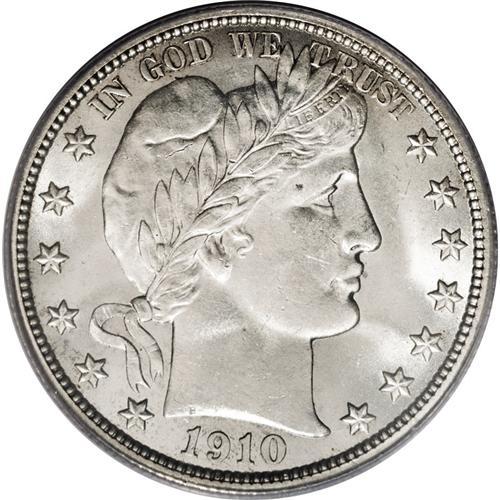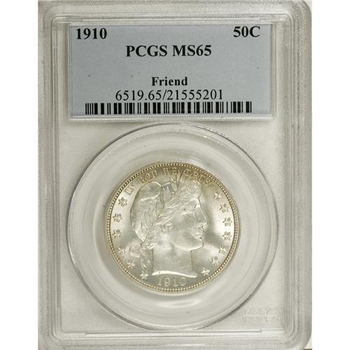 <B>1910 50C MS65 PCGS.</B></I> Ex: Friend. A brilliant and lovely Gem example of this low-mintage date, produced to the extent of only 418,000 business strikes. The frosty surfaces are brilliant except for a slight accent of golden around the margins. The strike is bold throughout, save for the right (facing) shield corner and the adjacent wingtip. Population: 21 in 65, 4 finer (4/07).<BR><BR><b>Shipping:</b> Coins & Currency (<a target="_blank" href="http://www.heritageauctions.com/common/shipping.php">view shipping information</a>)