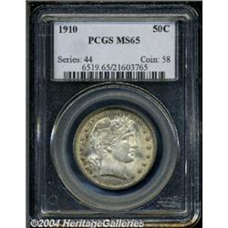 <B>1910<50C> MS65 PCGS.</B></I> A well preserved example, boldly detailed in all areas and showing lusciously toned, satiny surfaces on both sides. The low mintage 1910 has actually shown up more often in Uncirculated grades than other higher mintage dates from this series, but Gems remain very elusive. Population: 15 in 65, 1 finer (3/04). <BR><BR><B>Important notice:</B> Heritage usually auctions material at the rate of 200-250 lots per hour. On some occasions eBay Live bid software or the Internet may not be able to keep up with the pace of the auction. We recommend placing a realistic absentee bid now as insurance to avoid disappointment. Occasionally the auctioneer may eliminate or reject an eBay Live bid, and the auctioneer may also reopen a lot after the close of the eBay live bidding (usually because we missed an audience bid), and may reject your bid even if it shows you as the winning bidder. By bidding via eBay Live, you agree that Heritage may award the lot to another bidder at its sole discretion under the circumstances described above or any other reasonable circumstances. Since eBay bids are not shown to us until we open the lot on the floor, we treat those bids just like floor bids. In most cases the floor responds before the eBay bid is presented to us, due to Internet lag time, so for consistency we have made it a policy that floor bids are always considered first over tie eBay live bids. Also please note that all Heritage lots purchased through eBay Live carry a 20% Buyer's Premium. Please make sure you read the Terms and Conditions before you bid. </span></font></tr></table></td></tr></table>