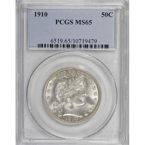 <B>1910 50C MS65 PCGS.</B></I> The obverse shows only a hint of gold toning, while the reverse has medium tan patina. Boldly struck with an immaculate reverse and unimportant portrait grazes. A lower mintage than usual for a Philadelphia issue, just 418,000 pieces. Population: 21 in 65, 4 finer (8/07).<BR><BR><B>Coin Engraver:</B> Charles E. Barber<BR><BR><b>Shipping:</b> Coins & Currency (<a target="_blank" href="http://www.heritageauctions.com/common/shipping.php">view shipping information</a>)