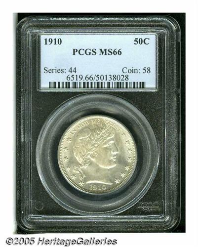 <B>1910<50C> MS66 PCGS.</B></I> Both sides of this impeccably preserved 1910 Half display excellent sharpness and radiant, subtly striated fields. As should be expected of a Premium Gem, surface marks are both sparing and inconsequential. The only comparable example of this low mintage P-mint we have offered in the past decade was the Queller specimen, which realized more than $14,000 in our January FUN Sale. Population: 3 in 66, 0 finer (5/05).