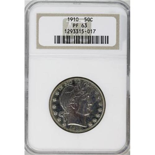 <B>1910 50C PR63 NGC.</B></I> Elegant gold and blue-green patina covers much of the obverse, while the gleaming reverse is largely silver-white. Sharply struck with light hairlines that are consistent with the grade assigned.<BR><BR><B>Coin Engraver:</B> Charles E. Barber<BR><BR><b>Shipping:</b> Coins & Currency (<a target="_blank" href="http://www.heritageauctions.com/common/shipping.php">view shipping information</a>)