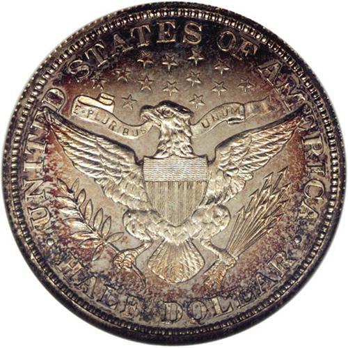 <B>1910<50C> PR66 NGC.</B></I> Although not certified as such, this example has all the hallmarks of a Cameo proof with lustrous devices and mirrored fields. Both sides have exquisite peripheral toning, especially on the reverse with its speckled iridescence. Although not in the same category as the 1913 through 1915 issues, this is another scarce date in business strike form.