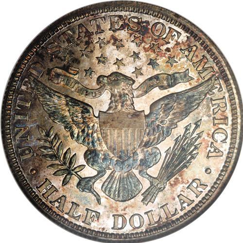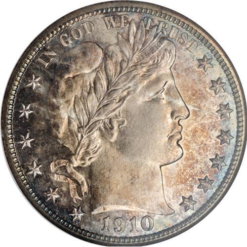 <B>1910<50C> PR67 NGC.</B></I> A sharply impressed specimen with exquisite gold, blue, and iridescent toning on both sides. The devices have slight evidence of frosty luster, and they are framed by reflective fields. Not quite enough contrast exists for a Cameo designation. Few finer examples of this date have been certified. This issue is also elusive in business strike format, thus proofs are often chosen by date collectors. Census: 20 in 67, 6 finer (3/06).