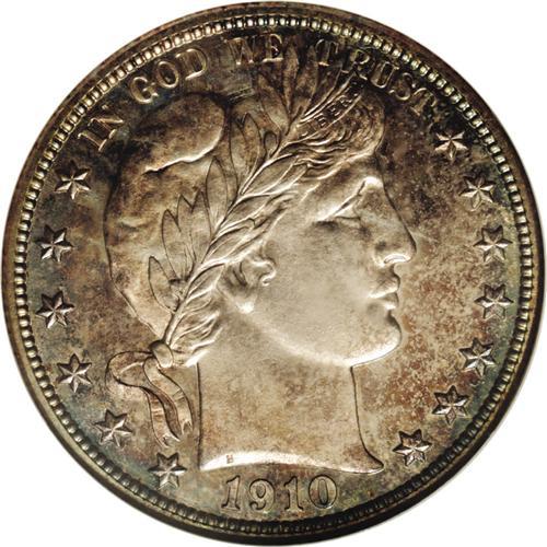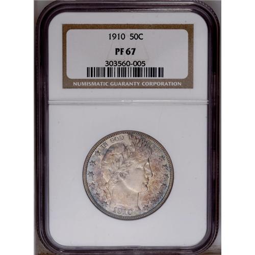 <B>1910 50C PR67 NGC.</B></I> A sharply impressed specimen with exquisite gold, blue, and iridescent toning on both sides. The devices have slight evidence of frosty luster, and they are framed by reflective fields. Not quite enough contrast exists for a cameo designation. Few finer examples of this date have been certified. This issue is also elusive in business strike format, thus proofs are often chosen by date collectors. Census: 20 in 67, 6 finer (1/06).