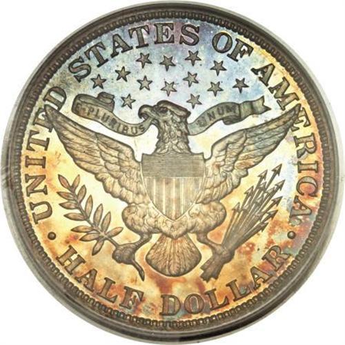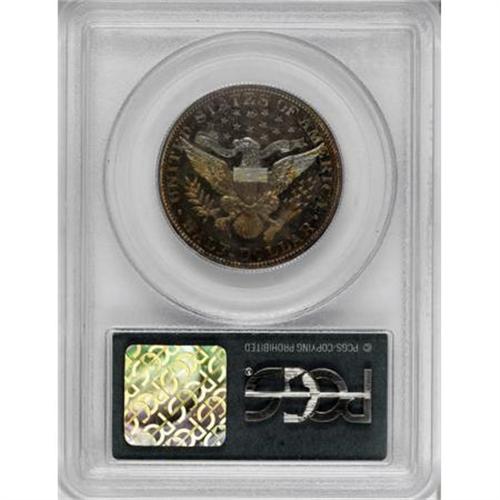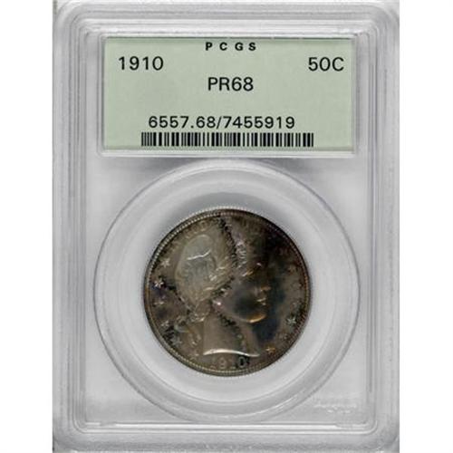 <B>1910 50C PR68 PCGS.</B></I> In more than 20 years of grading and certifying coins, as of (3/08) PCGS has certified a total of only 50 Barber halves in PR68, including five with a Cameo designation and eight Deep Cameo, and there are none finer. This is the only piece of the 1910 issue certified PR68, regardless of contrast. The obverse has a silver crescent, with iridescent ochre, steel-blue, and violet predominating elsewhere. On the reverse the color palette is similar, but all-encompassing. The strike is as bold as ever seen on a Barber half, with only minuscule weakness on the right shield corner, and the eye appeal is breathtaking. Certified in a green-label holder.<BR><BR><B>Coin Engraver:</B> Charles E. Barber<BR><BR><b>Shipping:</b> Coins & Currency (<a target="_blank" href="http://www.heritageauctions.com/common/shipping.php">view shipping information</a>)