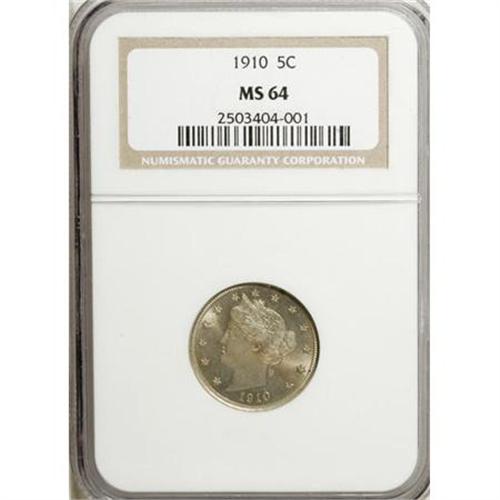<B>1910 5C MS64 NGC.</B></I> NGC Census: (166/76). PCGS Population (183/72). Mintage: 30,169,352. Numismedia Wsl. Price for NGC/PCGS coin in MS64: $200. (#3871)<BR><BR><B>Coin Engraver:</B> Charles E. Barber<BR><BR><b>Shipping:</b> Coins & Currency (<a target="_blank" href="http://www.heritageauctions.com/common/shipping.php">view shipping information</a>)