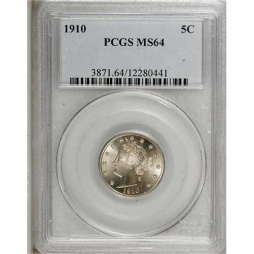 <B>1910 5C MS64 PCGS.</B></I> . PCGS Population (186/72). NGC Census: (165/76). Mintage: 30,169,352. Numismedia Wsl. Price for NGC/PCGS coin in MS64: $200. (#3871)<BR><BR><B>Coin Engraver:</B> Charles E. Barber<BR><BR><b>Shipping:</b> Coins & Currency (<a target="_blank" href="http://www.heritageauctions.com/common/shipping.php">view shipping information</a>)