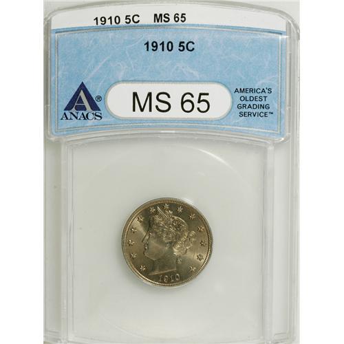 <B>1910 5C MS65 ANACS.</B></I> NGC Census: (64/12). PCGS Population (61/10). Mintage: 30,169,352. Numismedia Wsl. Price: $565. (#3871)<BR><BR><b>Shipping:</b> Coins & Currency (<a target="_blank" href="http://www.heritageauctions.com/common/shipping.php">view shipping information</a>)
