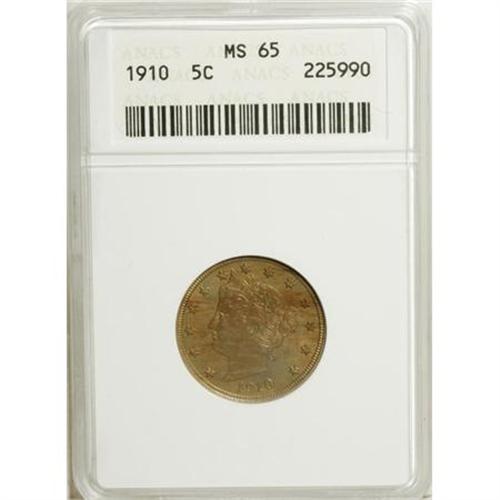 <B>1910 5C MS65 ANACS.</B></I> NGC Census: (63/13). PCGS Population (62/10). Mintage: 30,169,352. Numismedia Wsl. Price for NGC/PCGS coin in MS65: $620. (#3871)<BR><BR><B>Coin Engraver:</B> Charles E. Barber<BR><BR><b>Shipping:</b> Coins & Currency (<a target="_blank" href="http://www.heritageauctions.com/common/shipping.php">view shipping information</a>\)