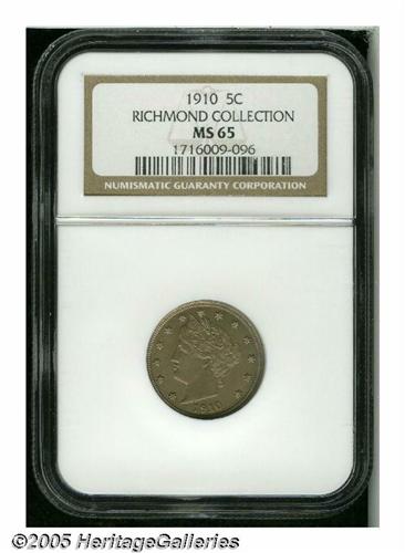 <B>1910<5C> MS65 NGC.</B></I> Ex: Richmond Collection. Deep golden-tan patina overlays soft luster. The design elements are nicely struck. A few minor marks on Liberty's neck are mentioned for accuracy. Population: 68 in 65, 11 finer (4/05).