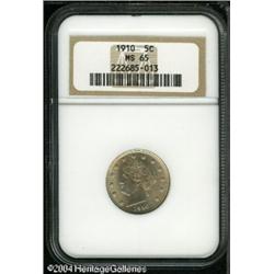 1910 5C MS65 NGC. Well struck, except for some of <B>1910 5C MS65 NGC.</B></I> Well struck, except for some of the star centers, and the ears of corn and wheat to the left of the bow knot. Faint olive-beige color rests over lustrous surfaces. A few minute marks are noted on Liberty's cheek and chin. Population: 69 in 65, 11 finer (11/04). <BR><BR><B>Important notice:</B> Heritage usually auctions material at the rate of 200-250 lots per hour. On some occasions eBay Live bid software or the Internet may not be able to keep up with the pace of the auction. We recommend placing a realistic absentee bid now as insurance to avoid disappointment. Occasionally the auctioneer may eliminate or reject an eBay Live bid, and the auctioneer may also reopen a lot after the close of the eBay live bidding (usually because we missed an audience bid), and may reject your bid even if it shows you as the winning bidder. By bidding via eBay Live, you agree that Heritage may award the lot to another bidder at its sole discretion under the circumstances described above or any other reasonable circumstances. Since eBay bids are not shown to us until we open the lot on the floor, we treat those bids just like floor bids. In most cases the floor responds before the eBay bid is presented to us, due to Internet lag time, so for consistency we have made it a policy that floor bids are always considered first over tie eBay live bids. Also please note that all Heritage lots purchased through eBay Live carry a 20% Buyer's Premium. Please make sure you read the Terms and Conditions before you bid. This lot is being auctioned in conjunction with a live floor auction by Heritage Galleries & Auctioneers. All final auction and invoice information will be supplied by Heritage Galleries & Auctioneers, and all other information should be considered preliminary. Lot:5535