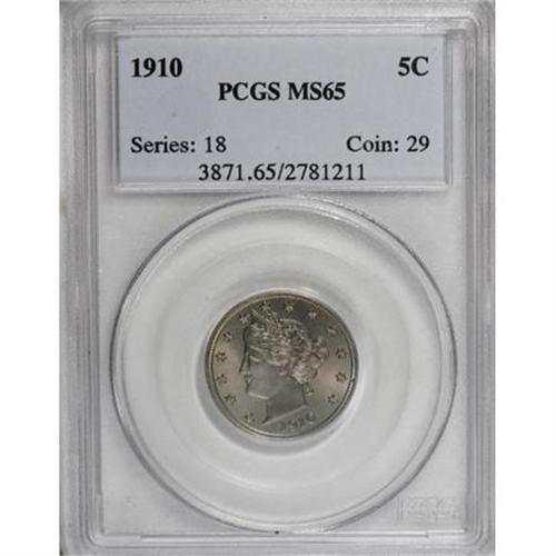 <B>1910 5C MS65 PCGS.</B></I> PCGS Population (62/10). NGC Census: (63/13). Mintage: 30,169,352. Numismedia Wsl. Price for NGC/PCGS coin in MS65: $620. (#3871)<BR><BR><B>Coin Engraver:</B> Charles E. Barber<BR><BR><b>Shipping:</b> Coins & Currency (<a target="_blank" href="http://www.heritageauctions.com/common/shipping.php">view shipping information</a>)
