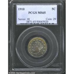 <TR><TD width="100%"><TABLE cellSpacing=1 cellPadding=3 width="100%" border=0><TBODY><TR><TD width="100%" bgColor=#79735c><FONT face=arial color=#ffffff size=3><B>Description</B> </FONT></TD></TR><TR><TD width="100%" bgColor=#ffffff><FONT face=arial size=2><B>1910 5C MS65 PCGS.</B></I> A vibrant red and green patina extends in almost a third of the way in from the peripheries and provides a very pleasing frame for the devices. A couple of faint hairlines to the left of the portrait as well as some scattered contact marks primarily near the denomination are the only flaws on this Gem quality coin. </FONT></TD></TR></TBODY></TABLE></TD></TR></TBODY></TABLE><BR><A name=PricesRealized></A><TABLE cellSpacing=0 cellPadding=0 width="100%" bgColor=#000000 border=0><TBODY><TR><TD width="100%"><TABLE cellSpacing=1 cellPadding=3 width="100%" border=0><TBODY><TR><TD width="100%" bgColor=#79735c><A name=PR><FONT face=arial color=#ffffff size=3><B>Previous Prices from Heritage Auctions</B> </FONT></A></TD></TR><TR><TD bgColor=#f6f6ed><TABLE cellSpacing=0 cellPadding=0 width="100%" border=1><TBODY><TR><TD align=middle width="33%"><B>Date</B></TD><TD align=middle width="33%"><B>Service</B></TD><TD align=middle width="33%"><B>Price</B></TD></TR><TR bgColor=whitesmoke><TD width="33%"><B>11/23/2002</B></TD><TD width="33%">PCGS</TD><TD width="33%">$575.00</TD></TR><TR bgColor=whitesmoke><TD width="33%"><B>08/05/2001</B></TD><TD width="33%">PCGS</TD><TD width="33%">$437.00</TD></TR><TR bgColor=whitesmoke><TD width="33%"><B>07/31/2001</B></TD><TD width="33%">NGC</TD><TD width="33%">$410.00</TD></TR><TR bgColor=whitesmoke><TD width="33%"><B>03/19/1997</B></TD><TD width="33%">NGC</TD><TD width="33%">$242.00</TD></TR><TR bgColor=whitesmoke><TD width="33%"><B>05/02/1997</B></TD><TD width="33%">PCGS</TD><TD width="33%">$357.50</TD></TR><TR bgColor=whitesmoke><TD width="33%"><B>03/23/2003</B></TD><TD width="33%">PCGS</TD><TD width="33%">$1,955.00</TD></TR></TBODY></TABLE></TD></TR><TR><TD bgColor=#ffffff><FONT face=arial size=1 ?>PLEASE NOTE: All prices realized reflect the final hammer price PLUS the buyer's premium in auctions that charge a buyer's premium. Each item has a notation at the top of the listing indicating whether that lot included a buyer's premium. Example: A item that sells with a final hammer price of $100 and a 20% buyer's premium will display with a price realized of $120. All information listed is intended to be as accurate as possible, but errors are possible. Please use this guide carefully and inform us of any inaccuracies. </FONT></TD></TR></TBODY></TABLE></TD></TR></TBODY></TABLE><BR><TABLE cellSpacing=0 cellPadding=0 width="100%" bgColor=#000000 border=0><TBODY><TR><TD width="100%"><TABLE cellSpacing=1 cellPadding=3 width="100%" border=0><TBODY><TR><TD width="100%" bgColor=#79735c colSpan=6><FONT face=arial color=#ffffff size=3><B>Price Guide*</B> </FONT></TD></TR><TR bgColor=#f6f6ed><TD align=middle><B>Grade</B> </TD><TD align=middle><B>Coin World<BR>(Trends)</B> </TD><TD align=middle><B>Numismedia<BR>Retail</B> </TD><TD align=middle><B>Numismedia<BR>Wholesale</B> </TD><TD align=middle><B>Coin<BR>Universe</B> </TD><TD align=middle><B>Heritage<BR>Value Index</B> </TD></TR><TR bgColor=#ffffff><TD align=middle>64</TD><TD align=right>$180.00</TD><TD align=right>$240.00</TD><TD align=right>$192.00</TD><TD align=right>$185.00</TD><TD align=right>$143.31</TD></TR><TR style="FONT-WEIGHT: bold" bgColor=#cccfdd><TD align=middle>65</TD><TD align=right>$550.00</TD><TD align=right>$640.00</TD><TD align=right>$510.00</TD><TD align=right>$600.00</TD><TD align=right>$426.25</TD></TR><TR bgColor=#ffffff><TD align=middle>66</TD><TD align=right>$1,850.00</TD><TD align=right>---</TD><TD align=right>$1,175.00</TD><TD align=right>$1,950.00</TD><TD align=right>$1,330.00</TD></TR><TR bgColor=#ffffff><TD colSpan=6><FONT size=1>*All information listed is intended to be as accurate as possible, but errors are possible. No item may be returned or refused based on this information which is provided as a service to our customers. You should contact each pricing source directly to determine the accuracy of this information. </FONT></TD></TR></TBODY></TABLE></TD></TR></TBODY></TABLE><BR><TABLE cellSpacing=0 cellPadding=0 width="100%" bgColor=#000000 border=0><TBODY><TR><TD width="100%"><TABLE cellSpacing=1 cellPadding=3 width="100%" border=0><TBODY><TR><TD width="100%" bgColor=#79735c><FONT face=arial color=#ffffff size=3><B>Population Guide</B> </FONT></TD></TR><TR bgColor=#ffffff><TD align=middle><!-- Begin Output of Population Grid--><TABLE cellSpacing=0 cellPadding=0 width="100%" border=0><TBODY><TR><TD vAlign=center><TABLE cellSpacing=0 width="100%" border=1 cellsadding="3"><TBODY><TR><TD vAlign=center><TABLE cellSpacing=0 cellPadding=3 width="100%" border=1><TBODY><TR><TD vAlign=center align=middle bgColor=#f0f1e8 colSpan=2 <CENTER><FONT face=Arial size=2><B>PCGS Pop </B></FONT><CENTER></CENTER></TD><TD vAlign=center align=middle bgColor=#f0f1e8 colSpan=2><CENTER><FONT face=Arial size=2><B>NGC Pop</B></CENTER></FONT></TD></TR><TR><TD vAlign=center><FONT face=Arial size=2>(65)</FONT> </TD><TD vAlign=center align=right><FONT face=Arial size=2>40</FONT> </TD><TD vAlign=center><FONT face=Arial size=2>(65)</FONT> </TD><TD vAlign=center align=right><FONT face=Arial size=2>58</FONT> </TD></TR><TR><TD vAlign=center><FONT face=Arial size=2>(>65)</FONT> </TD><TD vAlign=center align=right><FONT face=Arial size=2>4</FONT> </TD><TD vAlign=center><FONT face=Arial size=2>(>65)</FONT> </TD><TD vAlign=center align=right><FONT face=Arial size=2>9</FONT> </TD></TR></TBODY></TABLE></TD></TR></TBODY></TABLE></TD></TR></TBODY></TABLE><!-- End Output of Population Grid--></TD></TR></TBODY></TABLE></TD></TR></TBODY></TABLE><BR><TABLE cellSpacing=0 cellPadding=0 width="100%" bgColor=#000000 border=0><TBODY><TR> Important notice: We expect to be auctioning lots at the rate of 200-250 per hour. On occasion eBay live bid software cannot kee
