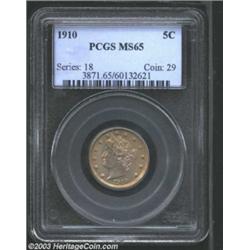 <TABLE cellSpacing=0 cellPadding=0 width="100%" bgColor=#000000 border=0><TBODY><TR><TD width="100%"><TABLE cellSpacing=1 cellPadding=3 width="100%" border=0><TBODY><TR><TD width="100%" bgColor=#79735c><FONT face=arial color=#ffffff size=3><B>Description</B> </FONT></TD></TR><TR><TD width="100%" bgColor=#ffffff><FONT face=arial size=2><B>1910 5C MS65 PCGS.</B></I> Well struck with satiny olive-gold surfaces. There are a pair of trivial slide marks near the obverse center. Only four examples have been graded finer by PCGS (8/03). </FONT></TD></TR></TBODY></TABLE></TD></TR></TBODY></TABLE><BR><A name=PricesRealized></A><TABLE cellSpacing=0 cellPadding=0 width="100%" bgColor=#000000 border=0><TBODY><TR><TD width="100%"><TABLE cellSpacing=1 cellPadding=3 width="100%" border=0><TBODY><TR><TD width="100%" bgColor=#79735c><A name=PR><FONT face=arial color=#ffffff size=3><B>Previous Prices from Heritage Auctions</B> </FONT></A></TD></TR><TR><TD bgColor=#f6f6ed><TABLE cellSpacing=0 cellPadding=0 width="100%" border=1><TBODY><TR><TD align=middle width="33%"><B>Date</B></TD><TD align=middle width="33%"><B>Service</B></TD><TD align=middle width="33%"><B>Price</B></TD></TR><TR bgColor=whitesmoke><TD width="33%"><B>06/18/2002</B></TD><TD width="33%">PCGS</TD><TD width="33%">$448.50</TD></TR><TR bgColor=whitesmoke><TD width="33%"><B>10/01/1993</B></TD><TD width="33%">PCGS</TD><TD width="33%">$495.00</TD></TR><TR bgColor=whitesmoke><TD width="33%"><B>04/28/2002</B></TD><TD width="33%">NGC</TD><TD width="33%">$310.50</TD></TR><TR bgColor=whitesmoke><TD width="33%"><B>01/30/2001</B></TD><TD width="33%">NGC</TD><TD width="33%">$410.00</TD></TR><TR bgColor=whitesmoke><TD width="33%"><B>09/23/1998</B></TD><TD width="33%">NGC</TD><TD width="33%">$308.00</TD></TR><TR bgColor=whitesmoke><TD width="33%"><B>07/29/2003</B></TD><TD width="33%">PCGS</TD><TD width="33%">$776.25</TD></TR></TBODY></TABLE></TD></TR><TR><TD bgColor=#ffffff><FONT face=arial size=1 ?>PLEASE NOTE: All prices realized reflect the final hammer price PLUS the buyer's premium in auctions that charge a buyer's premium. Each item has a notation at the top of the listing indicating whether that lot included a buyer's premium. Example: A item that sells with a final hammer price of $100 and a 20% buyer's premium will display with a price realized of $120. All information listed is intended to be as accurate as possible, but errors are possible. Please use this guide carefully and inform us of any inaccuracies. </FONT></TD></TR></TBODY></TABLE></TD></TR></TBODY></TABLE><BR><TABLE cellSpacing=0 cellPadding=0 width="100%" bgColor=#000000 border=0><TBODY><TR><TD width="100%"><TABLE cellSpacing=1 cellPadding=3 width="100%" border=0><TBODY><TR><TD width="100%" bgColor=#79735c colSpan=6><FONT face=arial color=#ffffff size=3><B>Price Guide*</B> </FONT></TD></TR><TR bgColor=#f6f6ed><TD align=middle><B>Grade</B> </TD><TD align=middle><B>Coin World<BR>(Trends)</B> </TD><TD align=middle><B>Numismedia<BR>Retail</B> </TD><TD align=middle><B>Numismedia<BR>Wholesale</B> </TD><TD align=middle><B>Coin<BR>Universe</B> </TD><TD align=middle><B>Heritage<BR>Value Index</B> </TD></TR><TR bgColor=#ffffff><TD align=middle>64</TD><TD align=right>$180.00</TD><TD align=right>$240.00</TD><TD align=right>$192.00</TD><TD align=right>$185.00</TD><TD align=right>$144.44</TD></TR><TR style="FONT-WEIGHT: bold" bgColor=#cccfdd><TD align=middle>65</TD><TD align=right>$550.00</TD><TD align=right>$640.00</TD><TD align=right>$510.00</TD><TD align=right>$600.00</TD><TD align=right>$443.75</TD></TR><TR bgColor=#ffffff><TD align=middle>66</TD><TD align=right>$1,850.00</TD><TD align=right>---</TD><TD align=right>$1,175.00</TD><TD align=right>$1,950.00</TD><TD align=right>$1,330.00</TD></TR><TR bgColor=#ffffff><TD colSpan=6><FONT size=1>*All information listed is intended to be as accurate as possible, but errors are possible. No item may be returned or refused based on this information which is provided as a service to our customers. You should contact each pricing source directly to determine the accuracy of this information. </FONT></TD></TR></TBODY></TABLE></TD></TR></TBODY></TABLE><BR><TABLE cellSpacing=0 cellPadding=0 width="100%" bgColor=#000000 border=0><TBODY><TR><TD width="100%"><TABLE cellSpacing=1 cellPadding=3 width="100%" border=0><TBODY><TR><TD width="100%" bgColor=#79735c><FONT face=arial color=#ffffff size=3><B>Population Guide</B> </FONT></TD></TR><TR bgColor=#ffffff><TD align=middle><!-- Begin Output of Population Grid--><TABLE cellSpacing=0 cellPadding=0 width="100%" border=0><TBODY><TR><TD vAlign=center><TABLE cellSpacing=0 width="100%" border=1 cellsadding="3"><TBODY><TR><TD vAlign=center><TABLE cellSpacing=0 cellPadding=3 width="100%" border=1><TBODY><TR><TD vAlign=center align=middle bgColor=#f0f1e8 colSpan=2 <CENTER><FONT face=Arial size=2><B>PCGS Pop </B></FONT><CENTER></CENTER></TD><TD vAlign=center align=middle bgColor=#f0f1e8 colSpan=2><CENTER><FONT face=Arial size=2><B>NGC Pop</B></CENTER></FONT></TD></TR><TR><TD vAlign=center><FONT face=Arial size=2>(65)</FONT> </TD><TD vAlign=center align=right><FONT face=Arial size=2>40</FONT> </TD><TD vAlign=center><FONT face=Arial size=2>(65)</FONT> </TD><TD vAlign=center align=right><FONT face=Arial size=2>59</FONT> </TD></TR><TR><TD vAlign=center><FONT face=Arial size=2>(>65)</FONT> </TD><TD vAlign=center align=right><FONT face=Arial size=2>4</FONT> </TD><TD vAlign=center><FONT face=Arial size=2>(>65)</FONT> </TD><TD vAlign=center align=right><FONT face=Arial size=2>9</FONT> </TD></TR></TBODY></TABLE></TD></TR></TBODY></TABLE></TD></TR></TBODY></TABLE><!-- End Output of Population Grid--> Important notice: Heritage usually auctions material at the rate of 200-250 lots per hour. On some occasions eBay Live bid software or the Internet may not be able to keep up with the pace of the auction. We recommend placing a realistic absentee bid now as insurance to avoid disappointment. Occasionally the auctioneer may eliminate or re