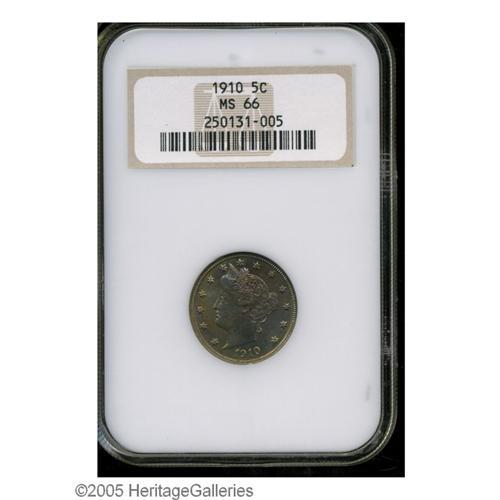 <B>1910<5C> MS66 NGC.</B></I> Pleasant rainbow-like toning blankets most of the reverse and a crescent shaped area of the lower obverse border. Well struck throughout, an attractive type coin selection. Population: 11 in 66, 1 finer (9/05).