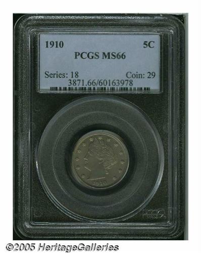 1910 5C MS66 PCGS. Boldly struck, save for slight