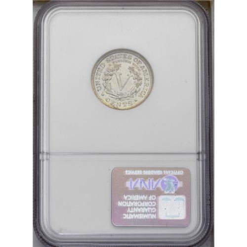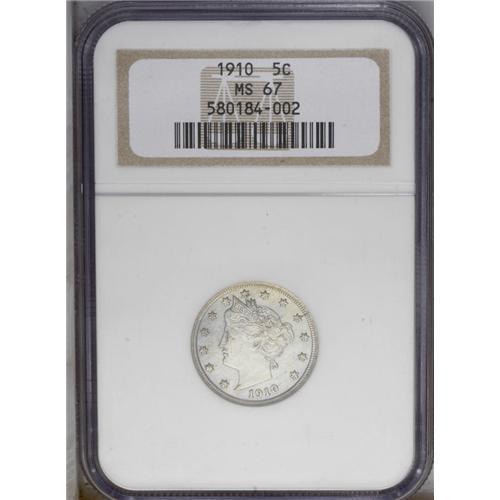 <B>1910<5C> MS67 NGC.</B></I> The otherwise pastel-lilac iridescence yields to golden-blue shades in select areas around the reverse periphery. While the typical Liberty nickel is poorly struck, the present example is a noteworthy exception. The obverse portrait and reverse features are powerfully impressed with crisp definition. Satiny and clean from rim to rim, it is little wonder that this is the single finest example certified by NGC (3/06).