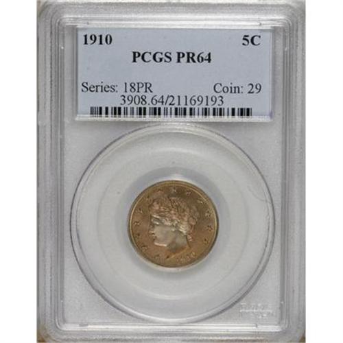 <B>1910 5C PR64 PCGS.</B></I> PCGS Population (178/246). NGC Census: (151/351). Mintage: 2,405. Numismedia Wsl. Price for NGC/PCGS coin in PR64: $240. (#3908)<BR><BR><b>Shipping:</b> Coins & Currency (<a target="_blank" href="http://www.heritageauctions.com/common/shipping.php">view shipping information</a>)
